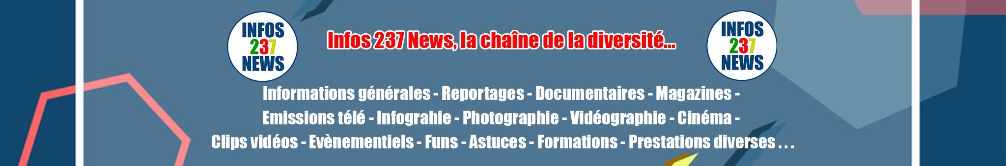 Salut à toutes et à tous. Bienvenue dans la chaine ''INFOS 237 NEWS''. Ici, vous retrouverez des informations générales, Reportages, Documentaires, Magazines, Émissions télé, Infographie, Photographie, Vidéographie, Cinéma, Clips vidéos, Évènementiels, Funs, Astuces, Formations, Prestations diverses . Peu importe le service que vous souhaitez, votre satisfaction sera notre priorité. Surtout n'oubliez pas de vous abonner à la chaîne. Likez, et activez la cloche de notification pour ne rater aucune de nos vidéos. Vous pouvez aussi nous laisser un petit commentaire, cela nous encouragera. Merci bien.